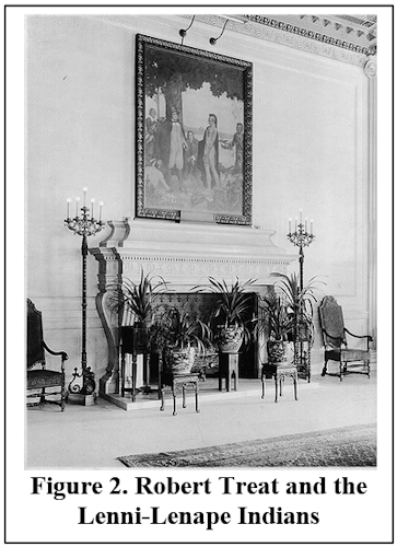 Lenni-Lenape Indian chief bartering with a man dressed like a Pilgrim.
